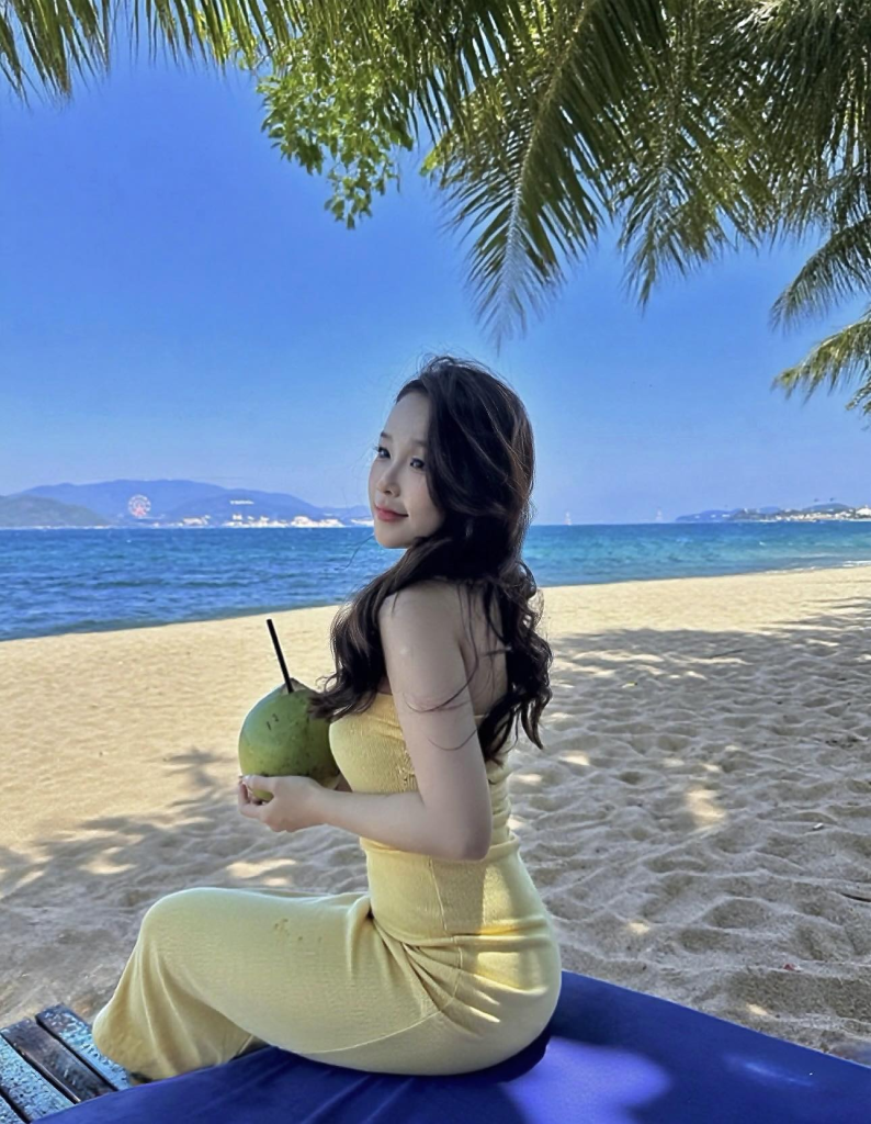 In her hands, she holds a fresh green coconut with a straw—an iconic symbol of tropical leisure. This small yet significant detail adds authenticity to the image, grounding it in a real, lived experience. It suggests not just a setting, but a lifestyle defined by relaxation, simplicity, and connection with nature.